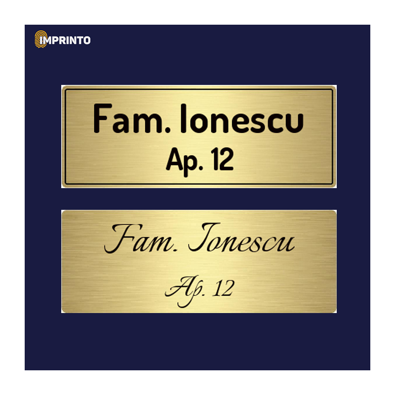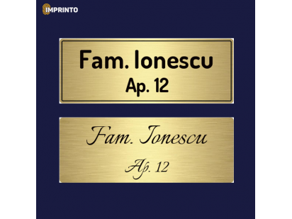 Gravură material auriu, scris negru, 80x30mm. Material plastic special pentru interior. Poate fi folosit și la exterior fără expunere directă la soare. Pentru materiale de exterior contactați-ne telefonic.