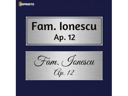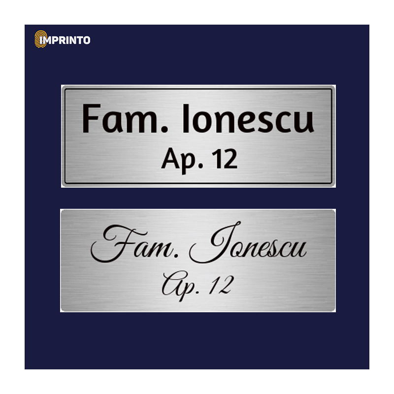 Gravură material argintiu, scris negru, 80x30mm. Material plastic special pentru interior. Poate fi folosit și la exterior fără expunere directă la soare. Pentru materiale de exterior contactați-ne telefonic.