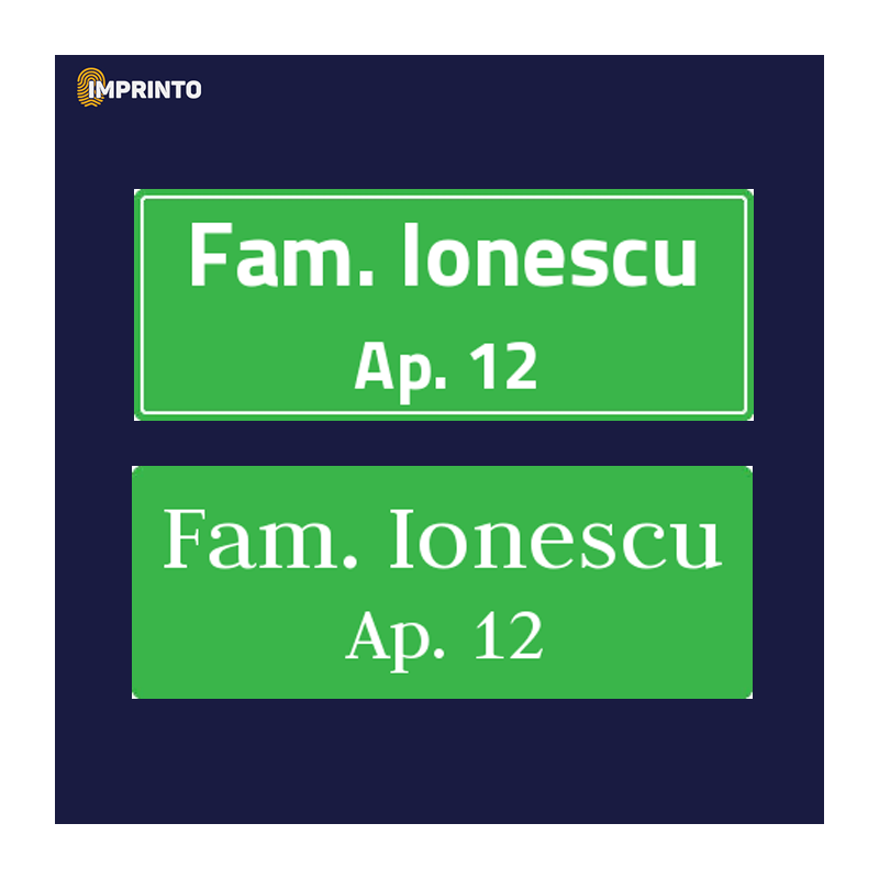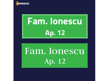 Gravură plastic verde cu scris alb, 80x30mm. Material plastic special pentru interior. Poate fi folosit și la exterior fără expunere directă la soare. Pentru materiale de exterior contactați-ne telefonic.